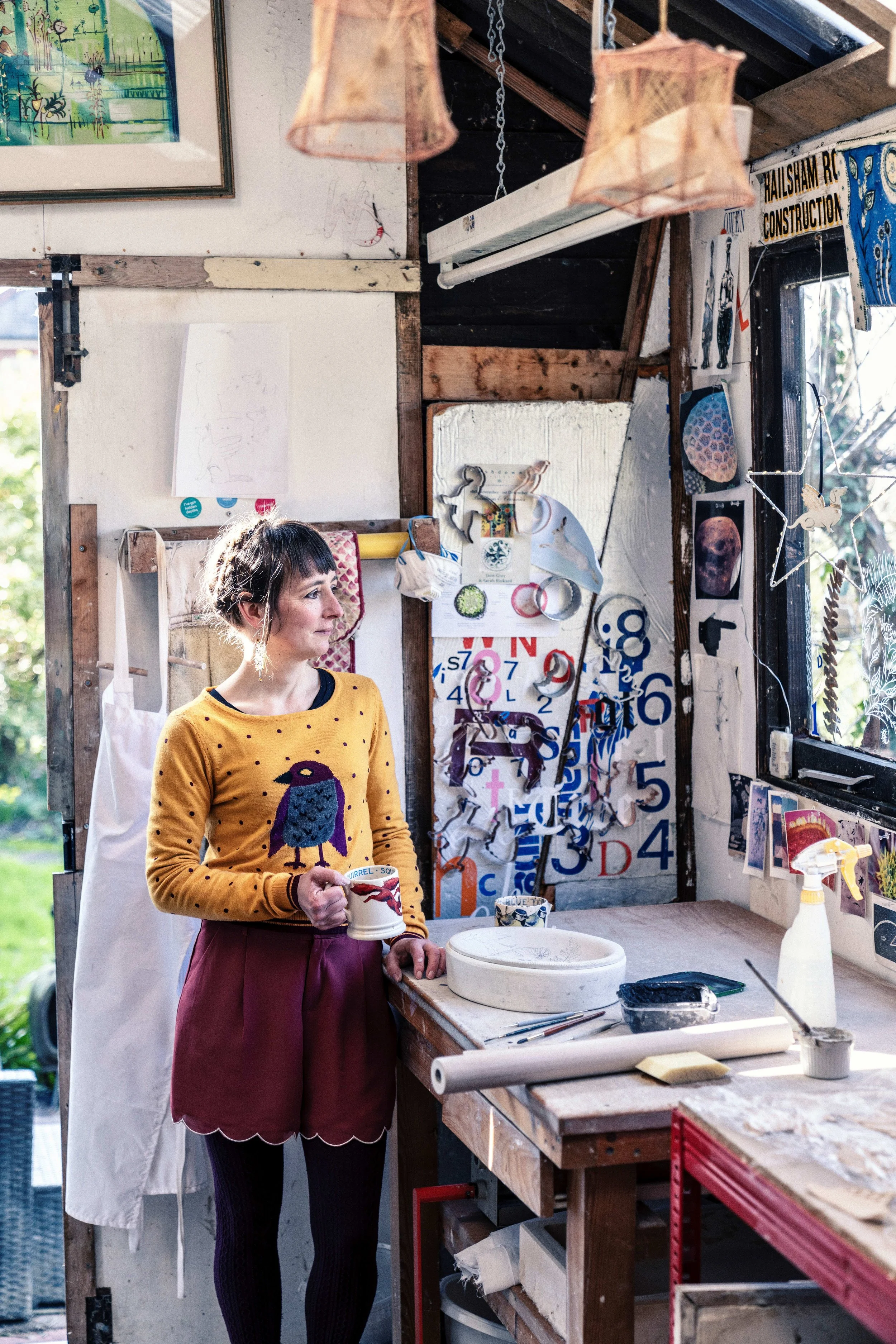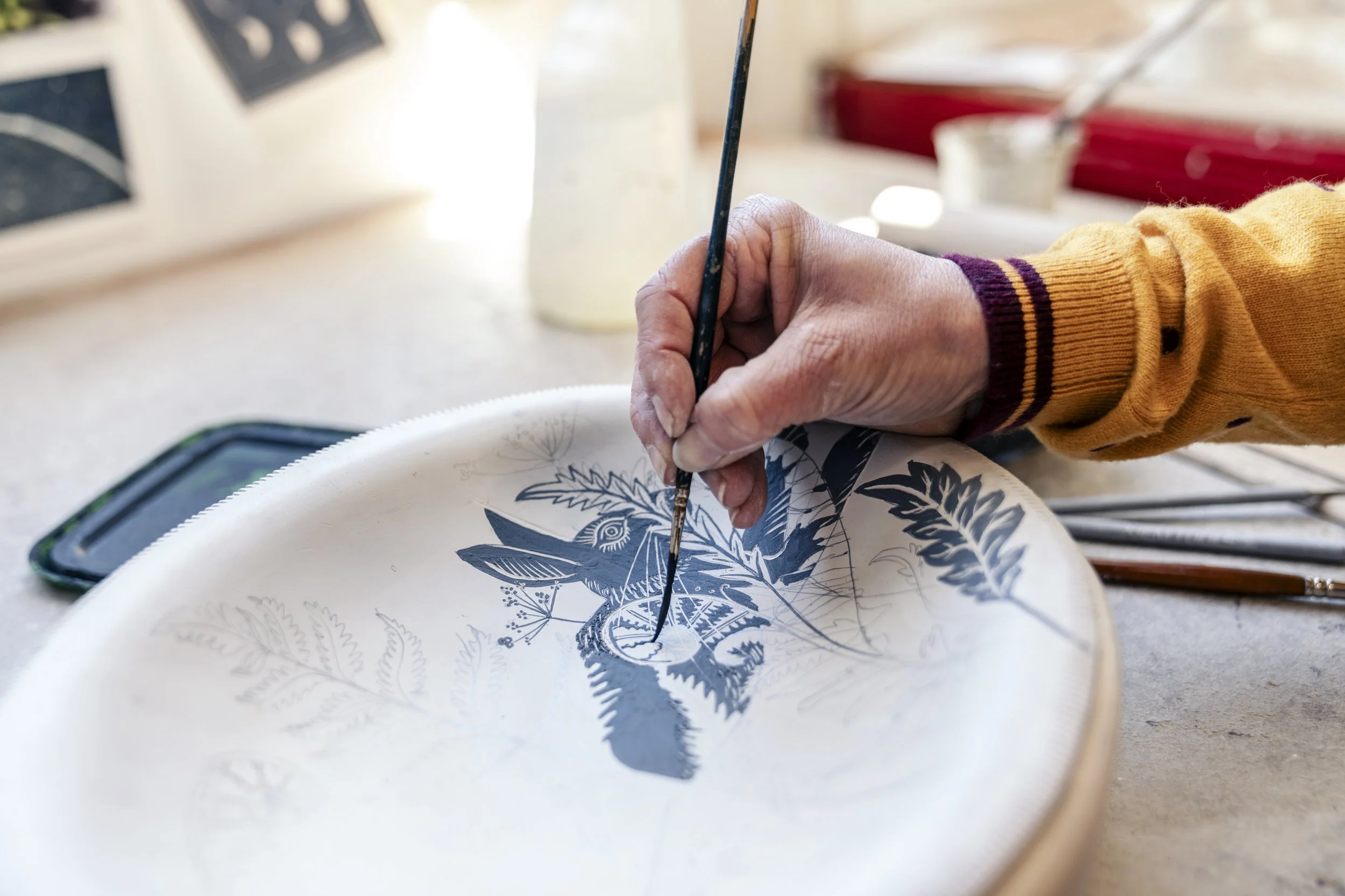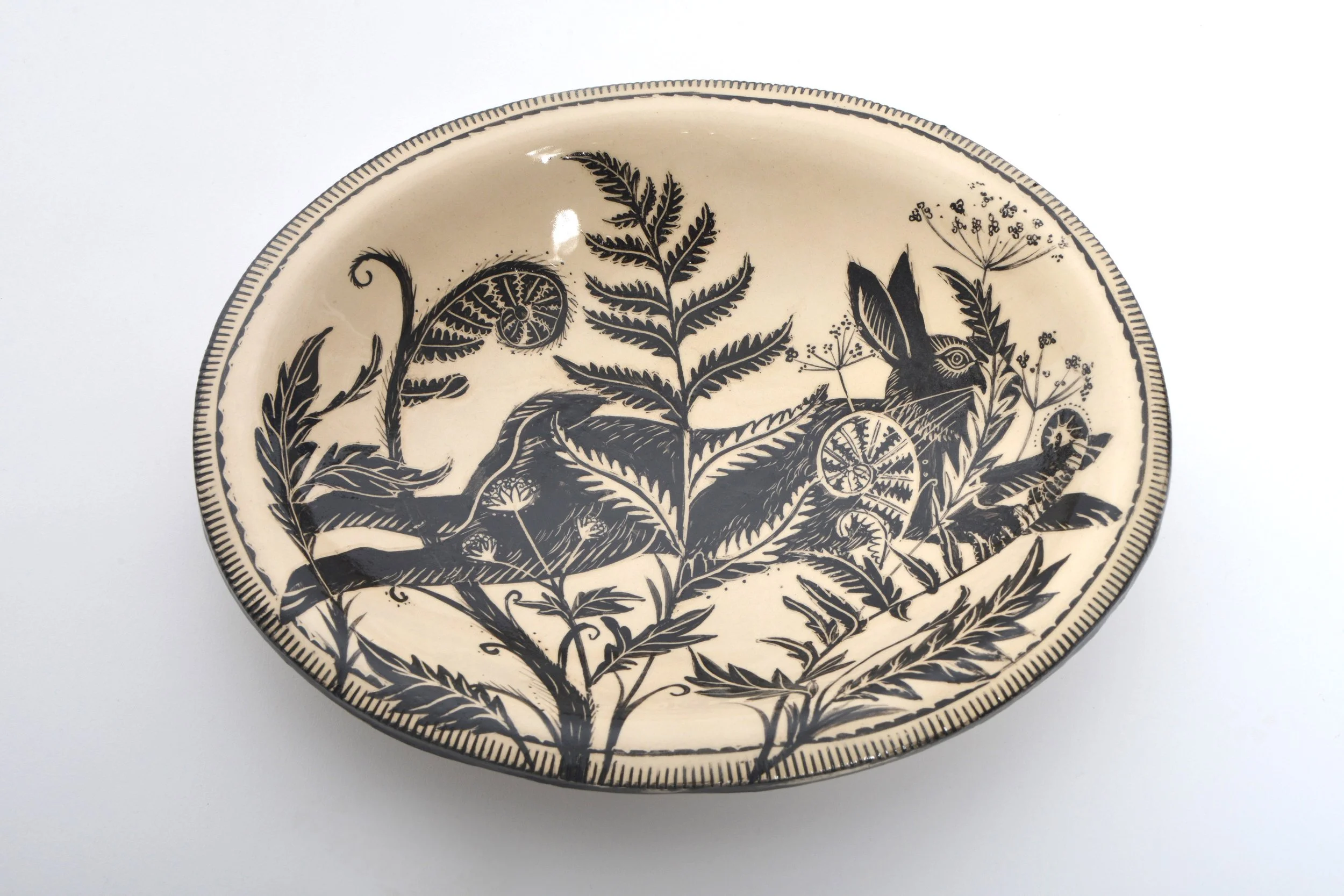 She creates her hand built ceramics from her garden studio in rural East Sussex, gaining inspiration from the surrounding countryside. Working mainly in earthenware and porcelain she puts a strong emphasis on the decoration due to her background in fine art and illustration. She uses slips, oxides, transfers and sgraffito technique to achieve her desired results.